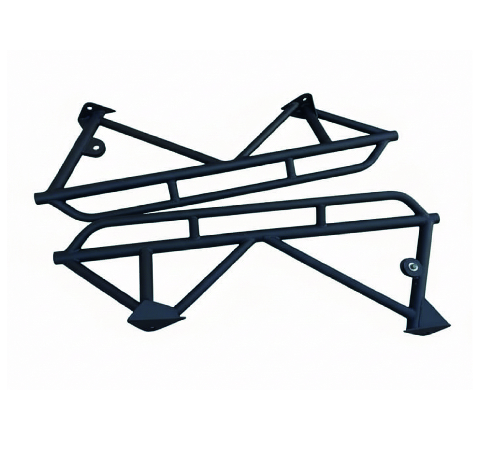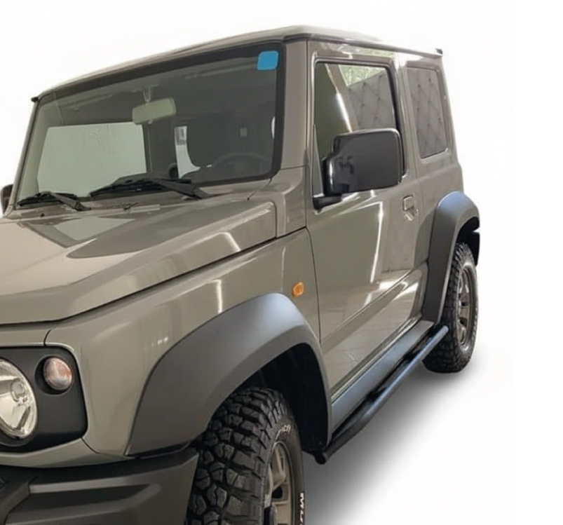 Rockslider Modelo 002 para Suzuki Jimny 3 puertas. Fabricado en acero de alta resistencia con diseño reforzado para máxima protección en rutas off-road. Brinda soporte estructural y protege la carrocería contra impactos en terrenos extremos. Acabado negro texturizado y ajuste directo a chasis.